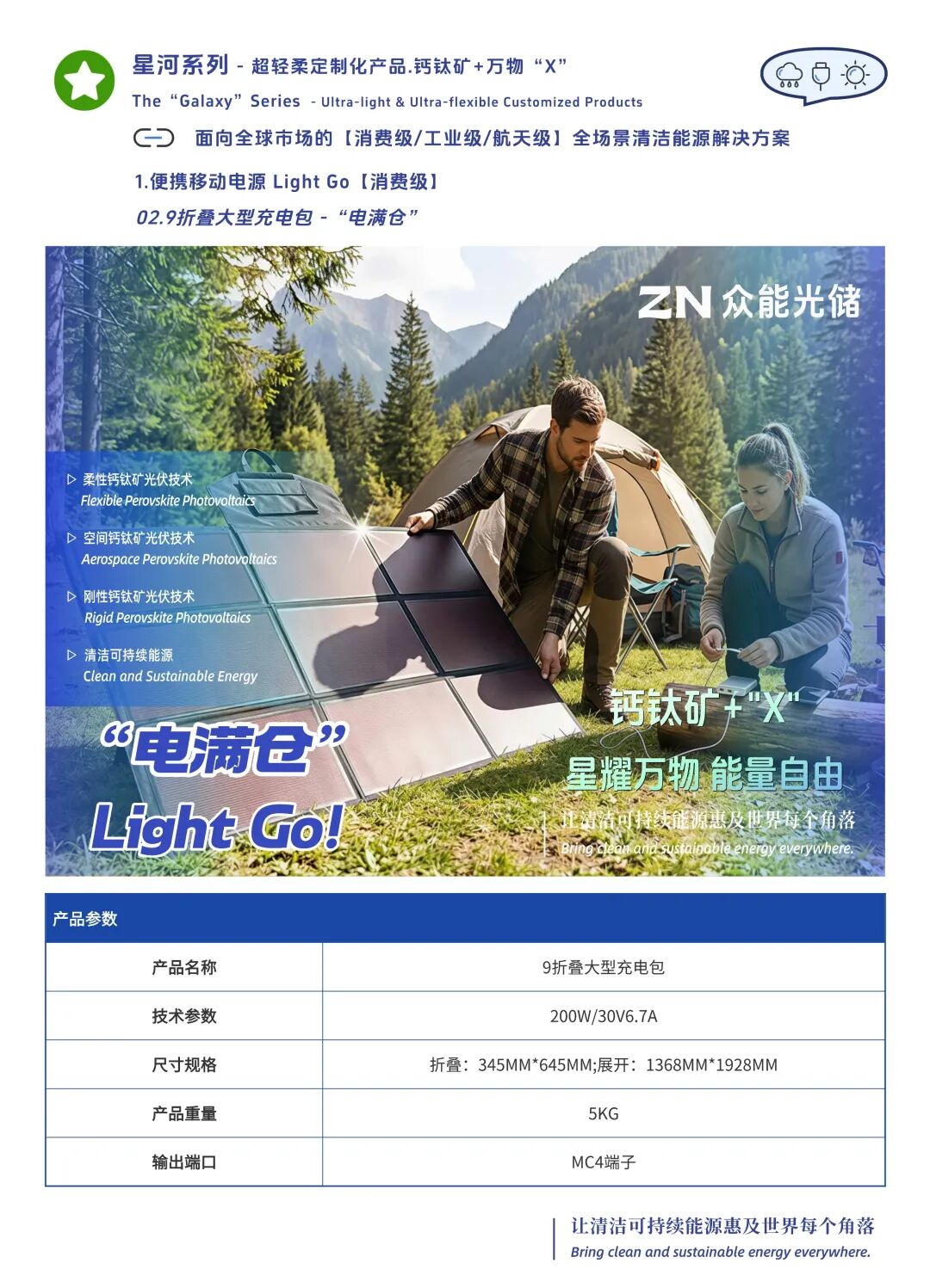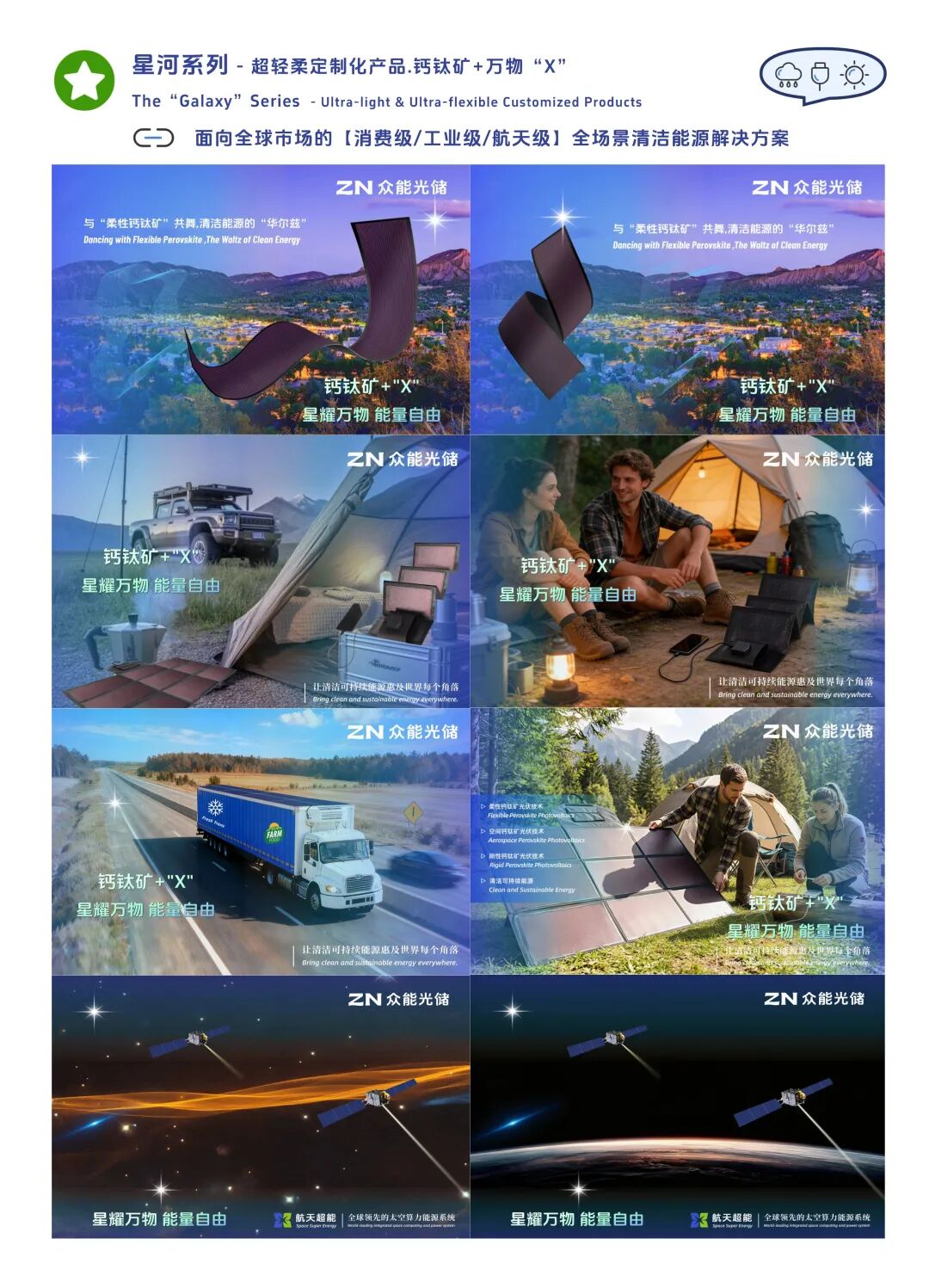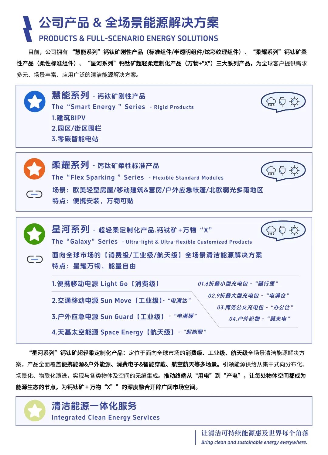 星河系列”超轻柔定制化产品:定位于面向全球市场的消费级、工业级、航天级(三个细分等级)全场景清洁能源解决方案,产品全面覆盖便携能源&户外能源、消费电子&智能穿戴、航空航天等多场景,引领能源供给从集中式向分布化、场景化、物联化演进,实现与各类物体及空间的无缝集成。推动终端从“用电”到“产电”,让每处物体空间都成为能源生态的节点,为钙钛矿 + 万物“X””的深度融合开辟广阔市场空间。