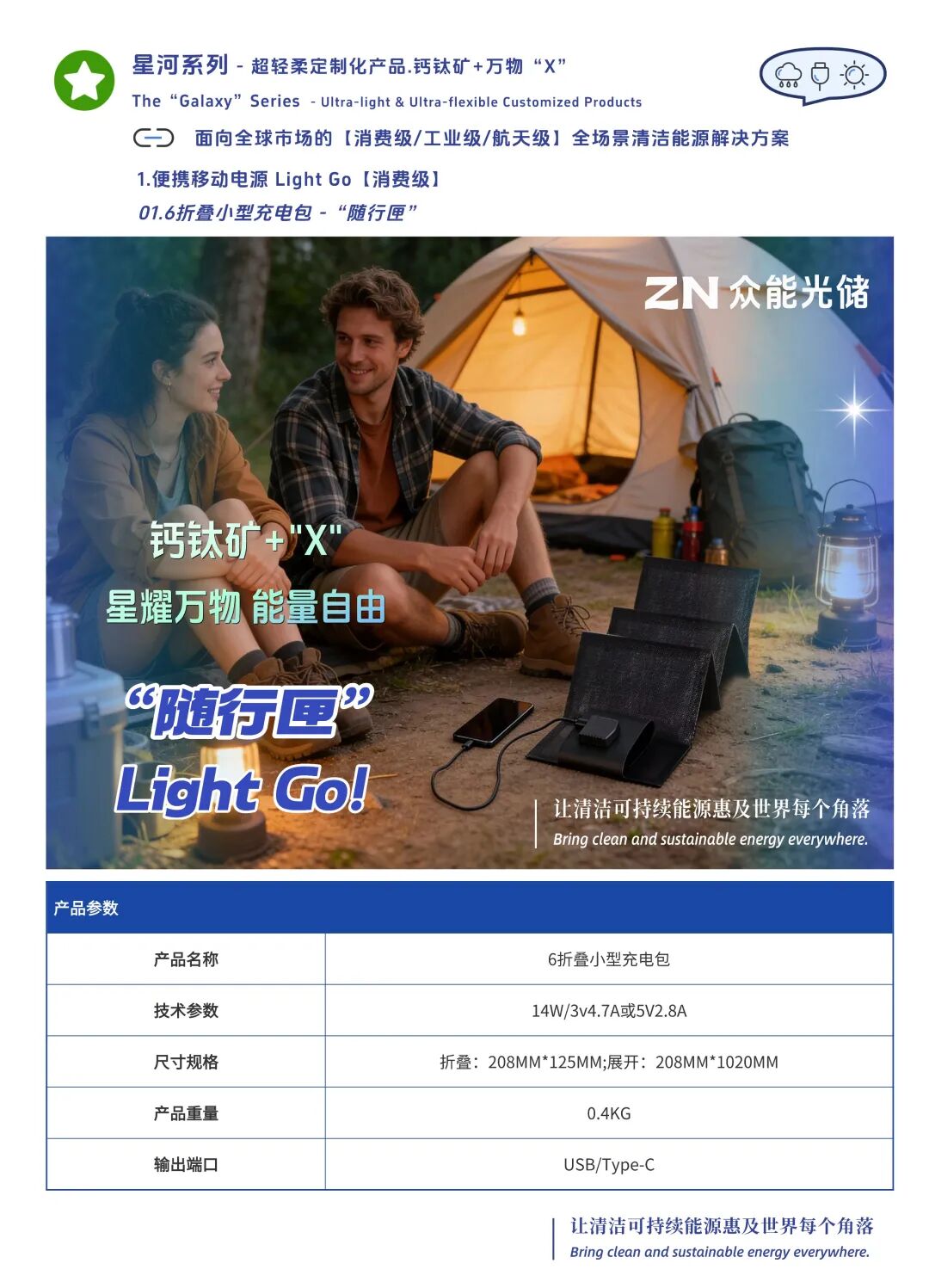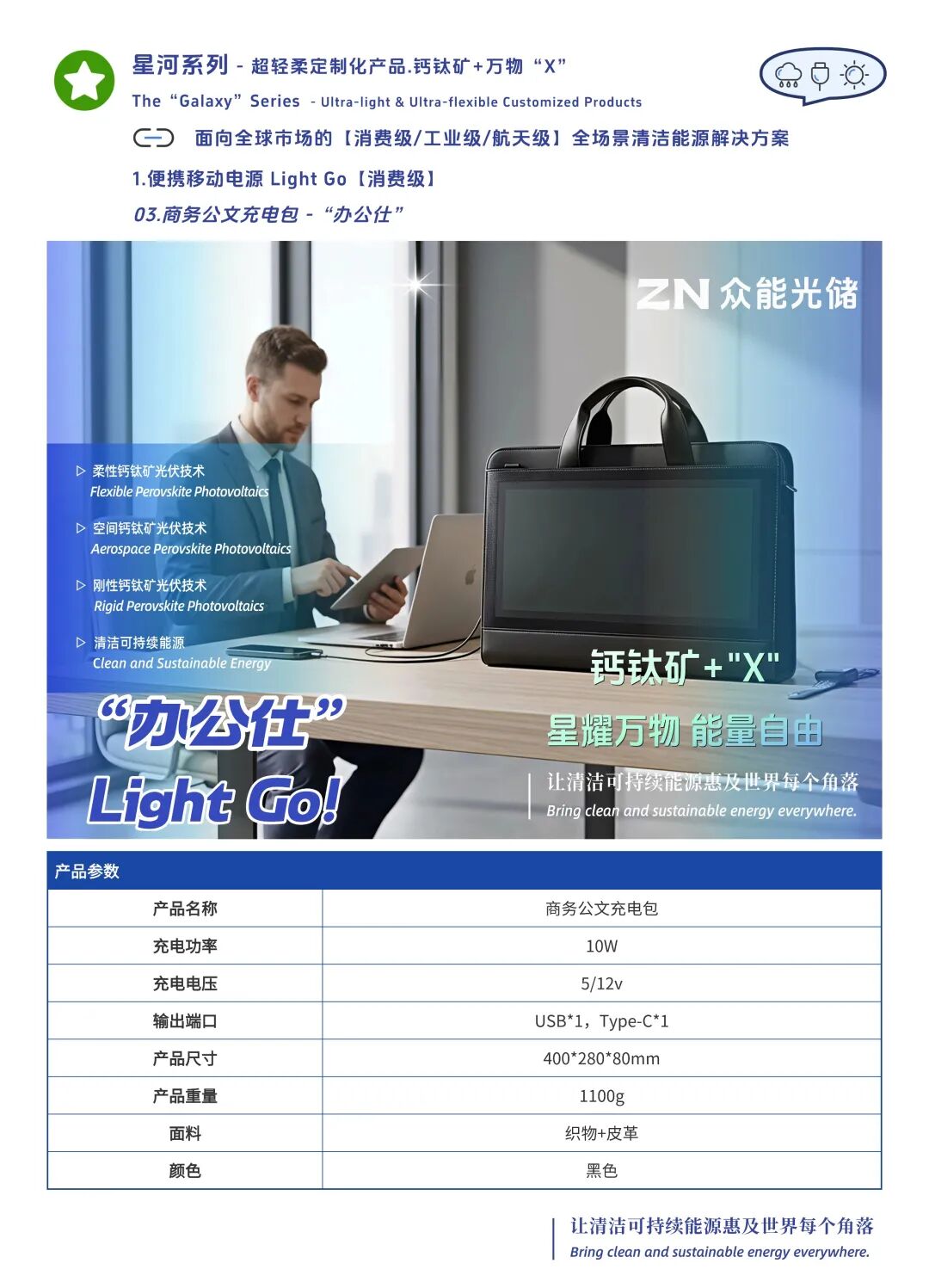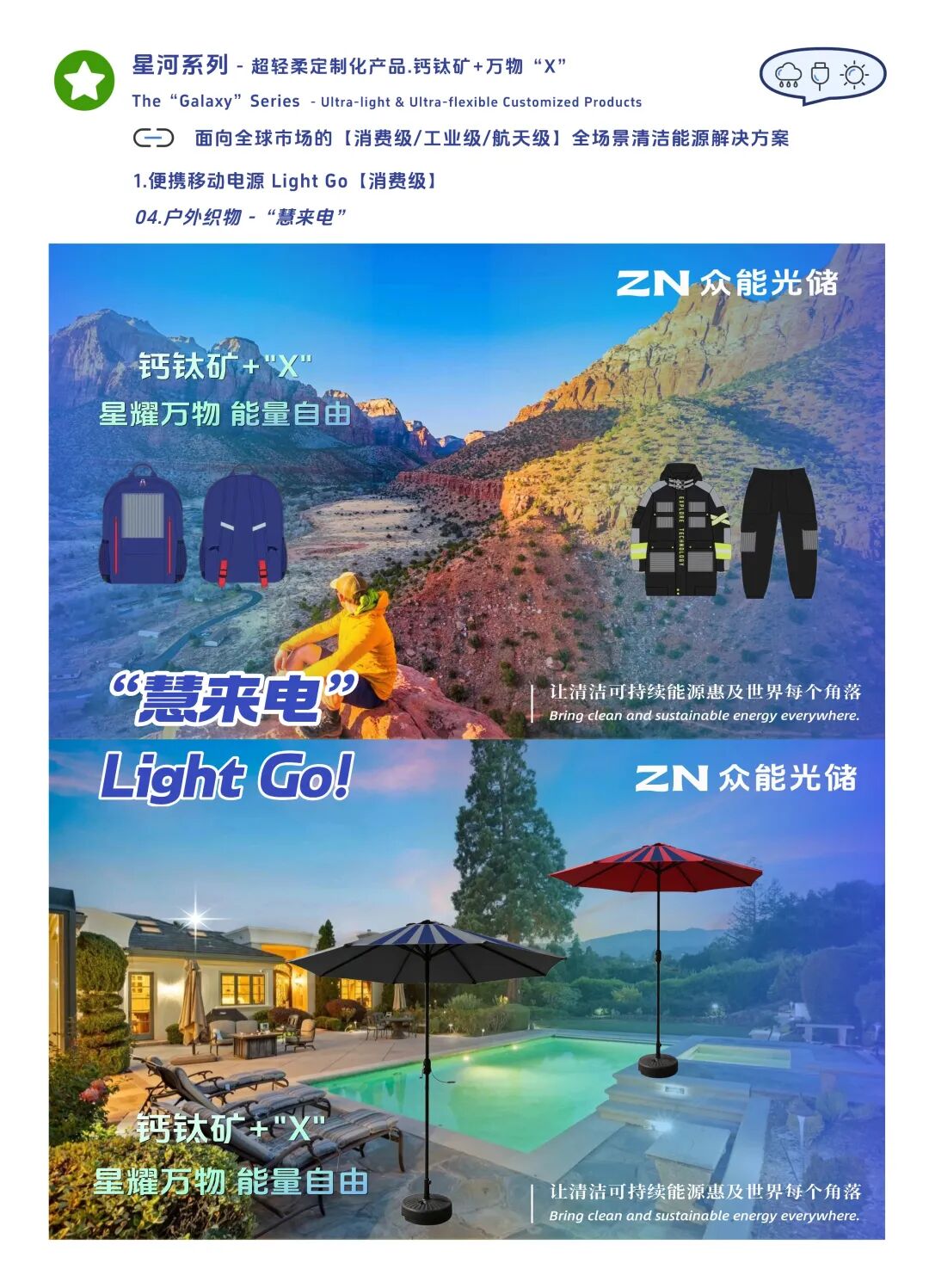 星河系列”超轻柔定制化产品:定位于面向全球市场的消费级、工业级、航天级(三个细分等级)全场景清洁能源解决方案,产品全面覆盖便携能源&户外能源、消费电子&智能穿戴、航空航天等多场景,引领能源供给从集中式向分布化、场景化、物联化演进,实现与各类物体及空间的无缝集成。推动终端从“用电”到“产电”,让每处物体空间都成为能源生态的节点,为钙钛矿 + 万物“X””的深度融合开辟广阔市场空间。